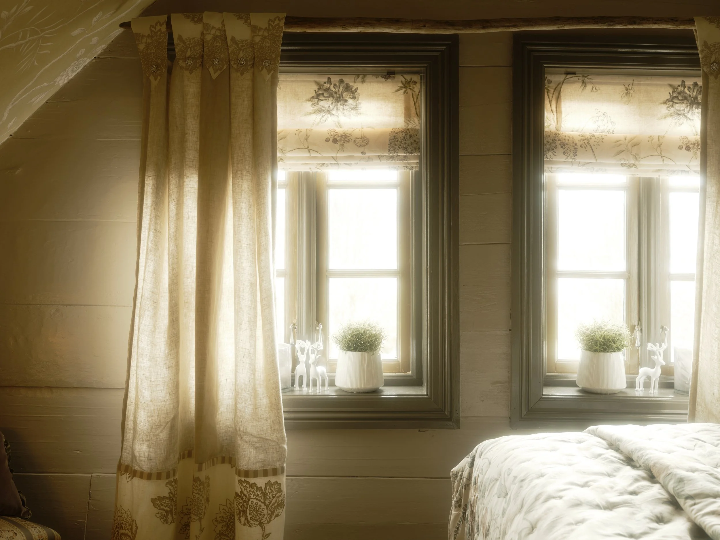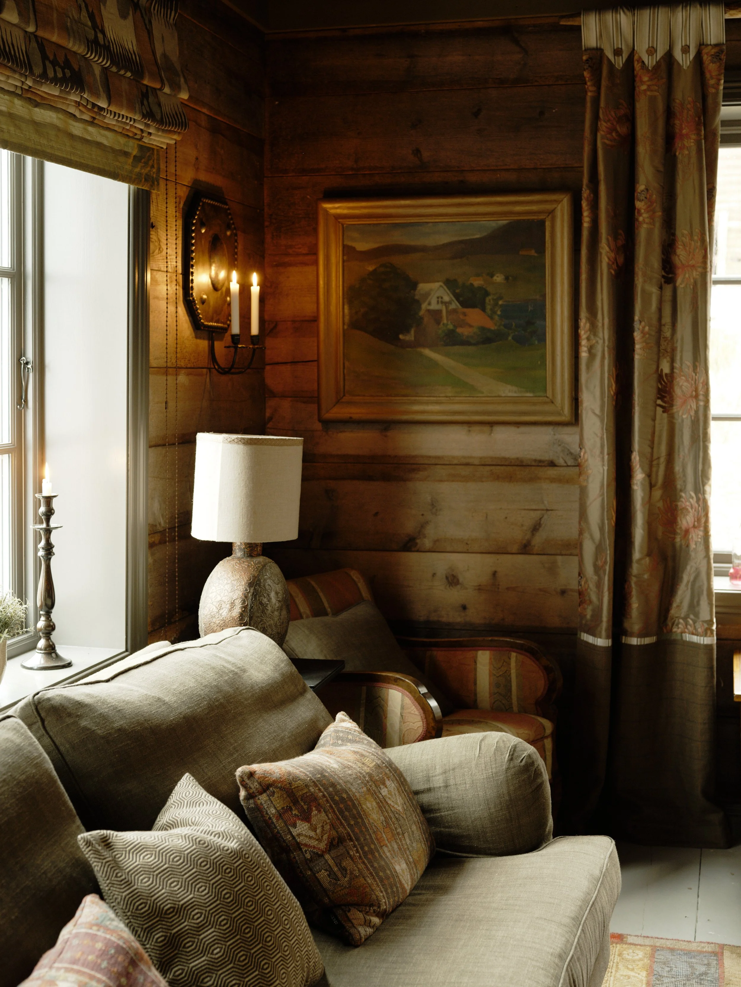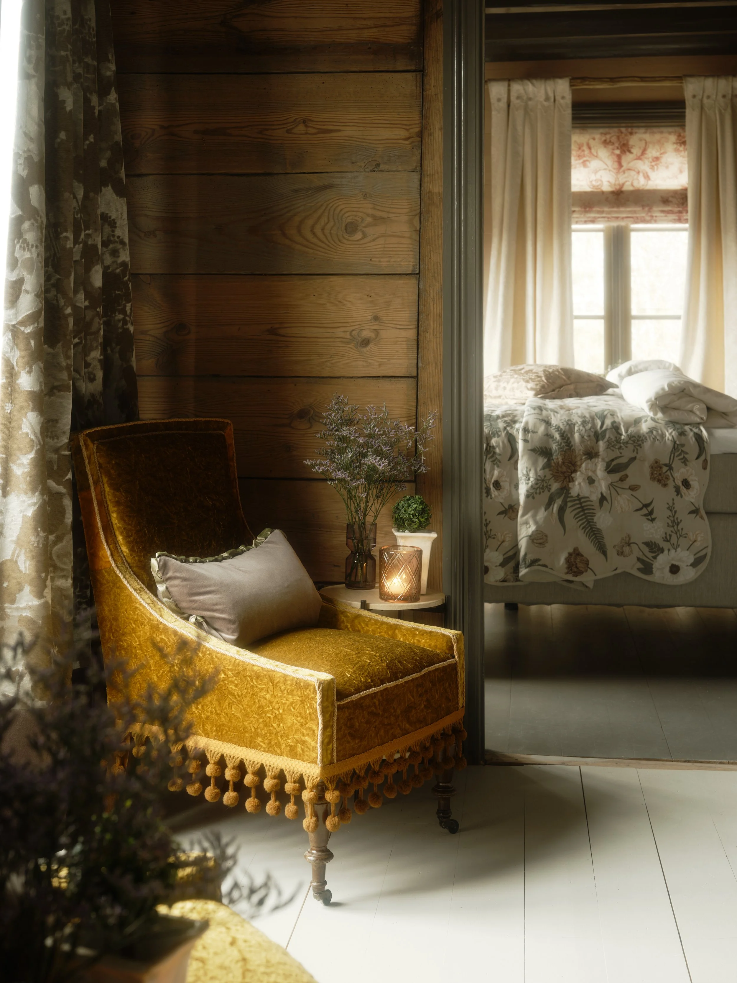 Hand-blocked wallpapers, deep windows, and a quiet language of textiles. Helmer holds the slower hours — a chamber of layered green, soft linen and the long Nordic dusk.